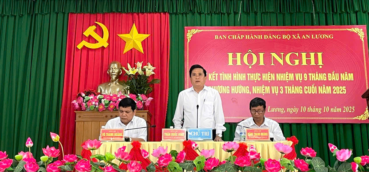 Chủ trì Hội nghị đồng chí Trần Quốc Vinh – Bí thư Đảng ủy, Chủ tịch HĐND xã; đồng chí Đặng Thanh Hoàng – Phó Bí thư Đảng ủy; đồng chí Võ Thanh Hoàng – Chủ tịch UBND xã. Ngoài ra, có sự tham dự của các đồng chí trong Thường trực HĐND, UBND, Ủy ban MTTQ, các ban, ngành, đoàn thể, các chi bộ trực thuộc xã.Kết quả nổi bật trong 9 tháng đầu năm Sau khi hợp nhất ba đơn vị hành chính: xã Mỹ Chánh- Mỹ Thành- Mỹ Cát, chính quyền xã An Lương đã nhanh chóng kiện toàn tổ chức, vận hành hiệu quả mô hình chính quyền địa phương hai cấp, đảm bảo công tác điều hành thông suốt, không để gián đoạn.